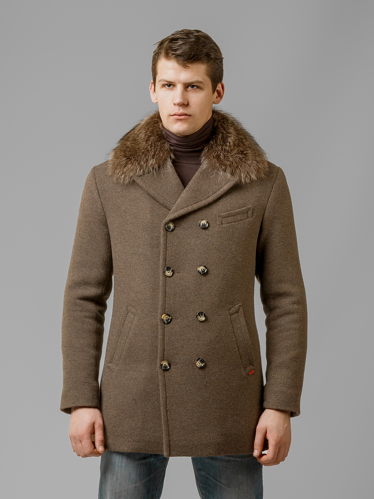A rich brown wool-blend overcoat with broad lapels and a plush fur collar. The double-breasted design evokes naval tradition while staying completely on-trend for modern winter wardrobes. Perfect for elevating colder days with tailored confidence.