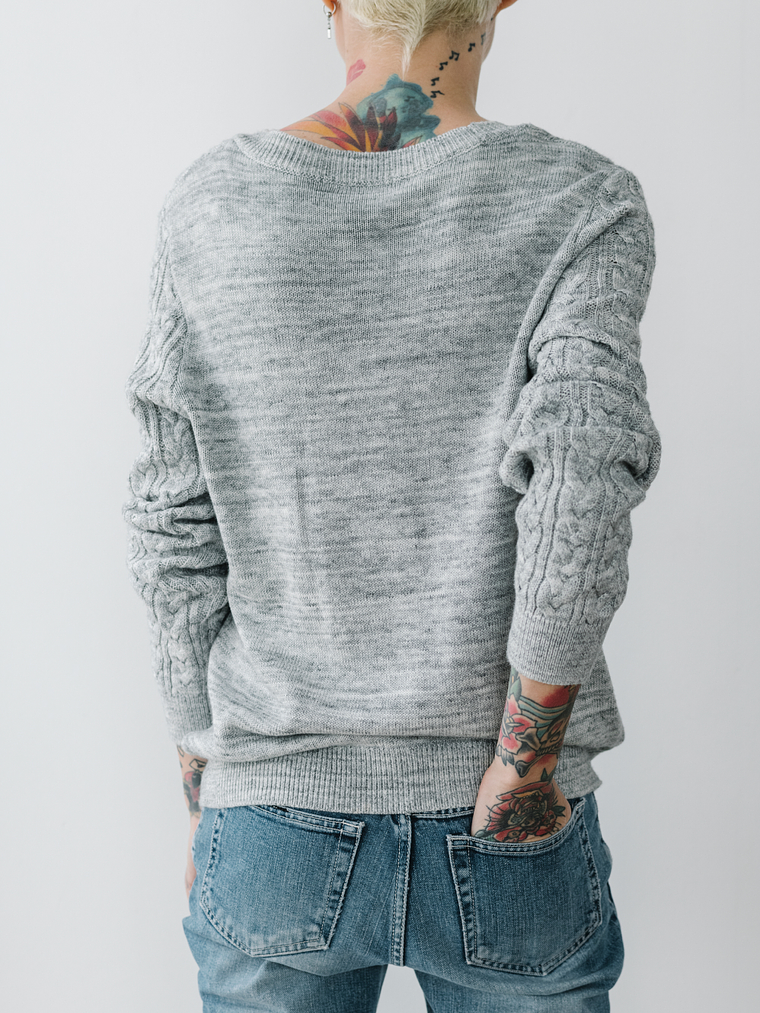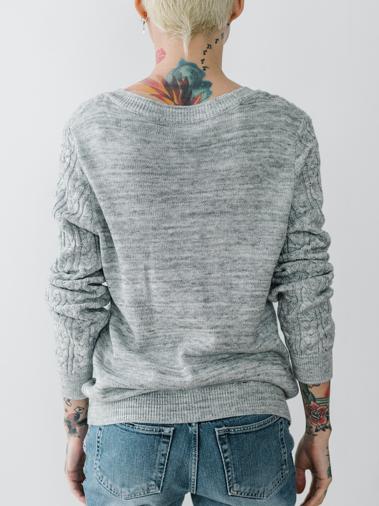Soft heather-grey pullover with textured cable-knit sleeves, ribbed crew neckline, cuffs & hem—relaxed fit for effortless layering.