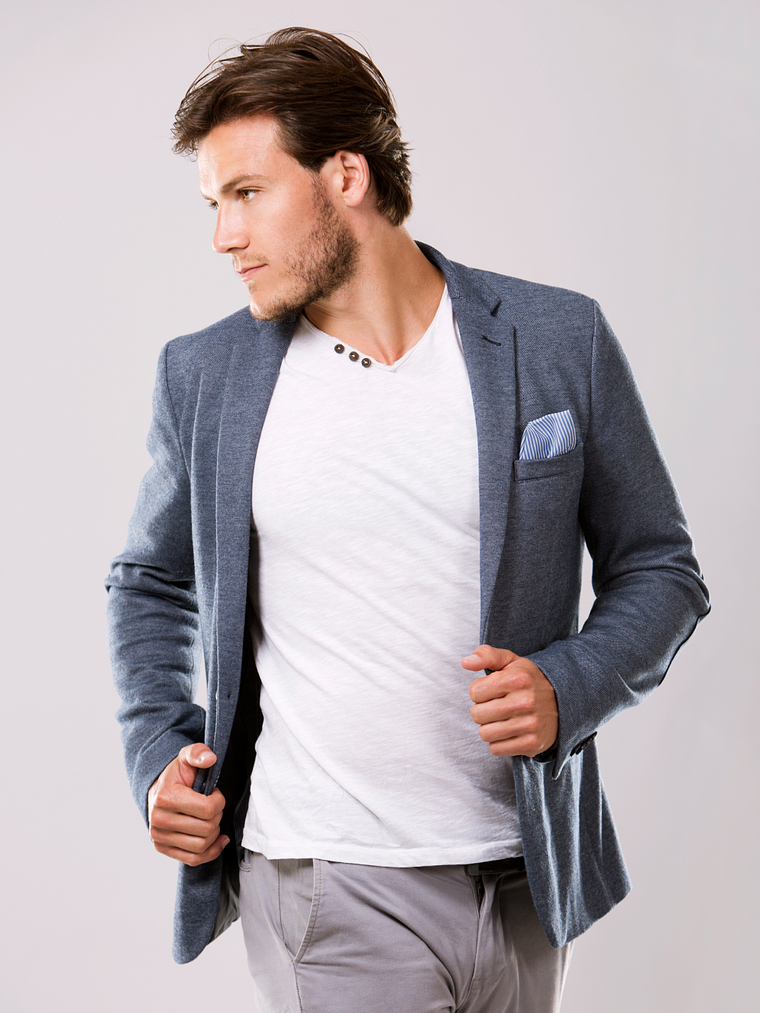 A relaxed-fit blazer in a cool steel blue tone, designed with soft shoulders and a clean, minimalist design. It features a stylish striped pocket square for an added dash of flair. Whether you're heading to a date or dressing up your daily outfit, this piece hits that sweet spot between effort and elegance.
